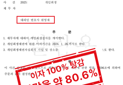 01. 사건 개요 본 사건은 젊은 나이에 가장이 되어 가족을 부양하던 의뢰인이 이혼 이후 급격한 소득 단절과 채무 누적으로 개인회생을 신청한 사안입니다. 의뢰인은 26세에 혼인하여 월 약 100만 원의 소득으로 3인을 부양하던 가장이었습니다. 배우자는 어린 자녀 양육으로 인해 소득 활동이 어려운 상황이었고, 생활비 충당을 위해 금융권 대출에 의존하게 되었습니다. 생활고로 인한 잦은 갈등 끝에 혼인 3년 만에 이혼에 이르렀고, 이 과정에서 위자료 2,000만 원을 마련하기 위해 추가 대출이 발생하였습니다. 이후 수입차 딜러로 근무를 시작하였으나 영업 실적 부진으로 안정적인 소득을 확보하지 못한 상태에서 생활비와 양육비를 지급하기 위해 금융권 차입이 계속되었습니다. 초기에는 연체 없이 상환을 이어왔으나, 음주운전으로 인한 권고사직 이후 소득이 급격히 단절되면서 연체가 발생하였고, 결국 신용불량 상태에 이르게 되었습니다. 이후 의뢰인은 일용직과 단기 아르바이트로 생계를 이어가며 채무 상환을 시도하였으나, 장기간 지속된 소득 불안정으로 채무를 감당하기 어려운 상태가 되었고, 현재 마흔의 나이에 다시 정상적인 생활을 회복하고자 개인회생을 신청하게 되었습니다. 한편, 이러한 상황에서도 양육비는 성실히 지급해 왔습니다. 02. 쟁점 정리 본 사건에서 법원이 중점적으로 검토한 사항은 다음과 같습니다. 채무 발생 원인이 사치나 투기가 아닌, 생계 유지·이혼 비용·양육비 부담에 기인한 것인지 여부 음주운전 이후의 소득 단절이 일시적이 아닌 구조적인 상환 불능 상태로 이어졌는지 여부 불안정한 소득 환경에서도 현실적인 변제계획 수립이 가능한지 여부 특히 이 사건은 이혼 이후 양육비를 계속 부담해 온 점과 장기간의 소득 불안정이 채무 누적의 직접적 원인이 되었다는 점이 핵심 쟁점이었습니다. 03. 호경의 조력 법률사무소 호경은 본 사건에서 의뢰인의 채무 발생 경위를 단순한 개인적 실패로 설명하지 않고, 혼인·이혼 과정, 소득 변화 시점, 채무 증가 흐름을 시간 순서에 따라 구조화하여 정리하였습니다. 특히 음주운전 이후의 소득 단절이 일회성 문제가 아닌, 이후 수년간 이어진 불안정한 생계 구조로 연결되었음을 객관적으로 소명하고, 양육비를 성실히 지급해 온 점을 포함하여 책임 회피 목적이 아닌 회생 의지를 중심으로 변제계획안을 수립하였습니다. ▶ 절차 진행 경과 2025.09.02. 개인회생 신청 2025.11.17. 개인회생 개시결정 04. 법원의 판단 및 결과 법원은 의뢰인의 채무 발생 경위, 소득 단절 사유, 양육비 부담 및 변제 가능성을 종합적으로 고려한 결과, 개인회생 절차를 통해 채무를 조정하는 것이 타당하다고 판단하였습니다. ▶ 사건 결과 개인회생 개시결정 이자 100% 전액 탕감 원금 변제율 약 24.86% 적용 원금 기준 약 75.14% 탕감 본 결정으로 의뢰인은 과도한 채무 부담에서 벗어나, 양육 책임을 지속하면서도 법원의 보호 아래 현실적인 회생 절차를 진행할 수 있게 되었습니다.