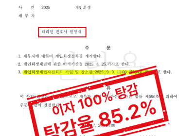 01. 사건 개요 본 사건은 가족 부양과 의료비 부담으로 채무가 누적된 의뢰인이 개인회생을 신청한 사안입니다. 의뢰인은 배우자와 혼인하여 두 자녀를 둔 가장으로, 2022년 큰 자녀가 조현병 진단을 받으면서 장기간 치료와 병원 진료가 필요한 상황에 놓이게 되었습니다. 동시에 고령의 노모가 치매를 앓고 있어, 의뢰인은 가족의 생계와 의료비를 모두 책임져야 하는 상황이었으나, 고령으로 인해 안정적인 고소득 직장을 구하기 어려웠고, 육체적으로 무리가 큰 직종 역시 선택하기 어려운 상태였습니다. 결국 가족들의 생활비와 의료비를 충당하기 위해 금융권 대출을 이용하게 되었고, 그 과정에서 채무가 점차 누적되어 정상적인 상환이 어려운 상황에 이르게 되었습니다. 02. 쟁점 정리 본 사건에서 법원이 중점적으로 검토한 사항은 다음과 같습니다. 채무 발생 원인이 사치나 투기 목적이 아닌, 가족 부양 및 의료비 지출에 기인한 것인지 여부 의뢰인의 연령과 소득 구조에서 현실적인 변제계획 수립이 가능한지 여부 다수의 부양가족이 존재하는 상황에서 개인회생 절차를 통한 채무 조정의 필요성 특히 의뢰인은 가족의 치료비와 생활비 부담이 지속적으로 발생하고 있어, 기존 채무 구조로는 회생이 사실상 불가능한 상태였습니다. 03. 호경의 조력 법률사무소 호경은 본 사건에서 의뢰인의 채무 발생 경위를 감정적으로 서술하기보다, 가족 부양 구조·의료비 지출 내역·소득 현실을 중심으로 법원이 판단할 수 있도록 사건을 구조화하였습니다. 의뢰인의 연령, 부양가족 현황, 의료비 부담이 장기적으로 지속될 수밖에 없는 점을 객관적으로 소명하고, 현실적인 월 변제 가능 범위를 기준으로 지속 가능한 변제계획안을 수립하여 제출하였습니다. ▶ 절차 진행 경과 2025.04.07. 개인회생 신청 2025.07.20. 개인회생 개시결정 04. 법원의 판단 및 결과 법원은 의뢰인의 채무 발생 경위, 가족 부양 상황, 소득 및 연령 등을 종합적으로 고려한 결과, 개인회생 절차를 통해 채무를 조정하는 것이 타당하다고 판단하였습니다. ▶ 사건 결과 개인회생 개시결정 이자 100% 전액 탕감 원금 변제율 약 14.8% 적용 원금 기준 약 85.2% 탕감 본 결정으로 의뢰인은 과도한 채무 부담에서 벗어나, 가족의 치료와 생계를 유지하면서 법원의 보호 아래 회생 절차를 진행할 수 있게 되었습니다.