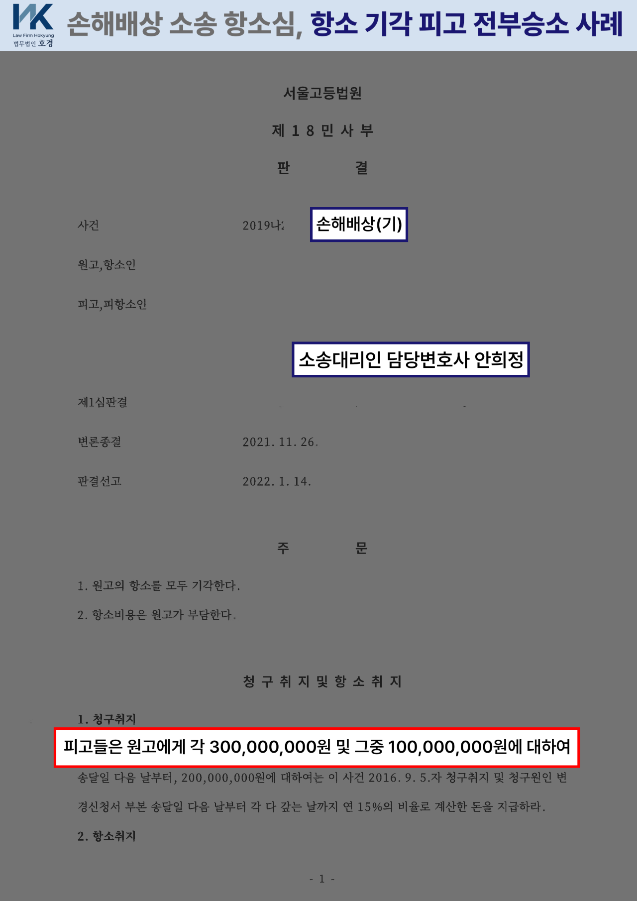 ※본 판결을 통해 피고는 약 3억 원에 달하는 손해배상 청구에 대해 전액 방어에 성공하였으며,
